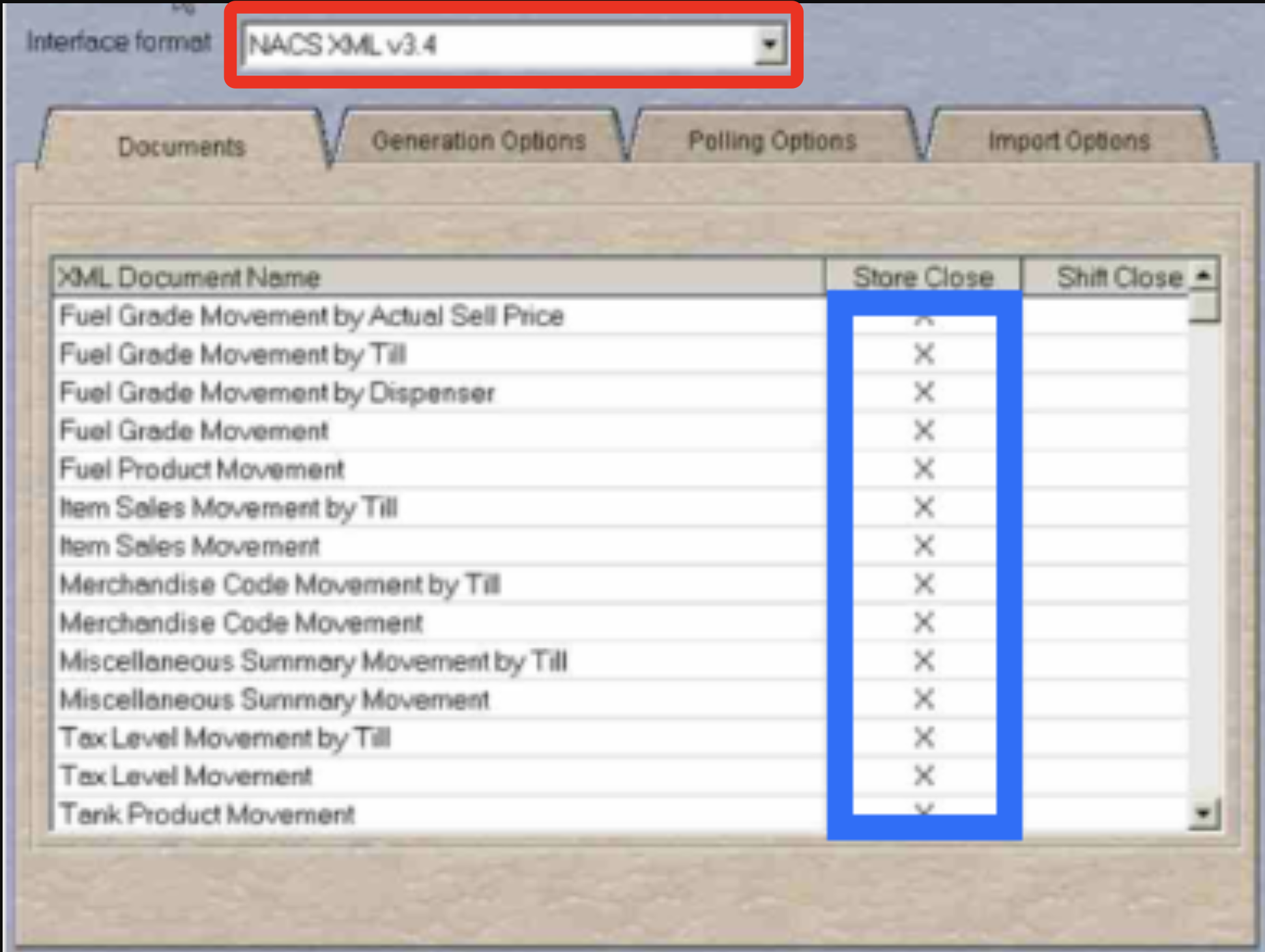 Click on the dropdown menu labeled Interface Format and choose NACS XML v3.4