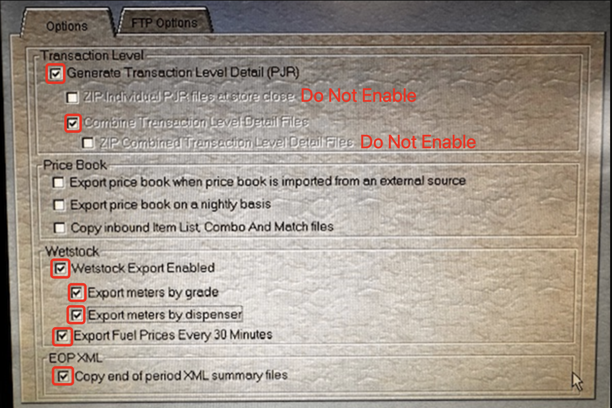 - From the Options tab, select the following items: